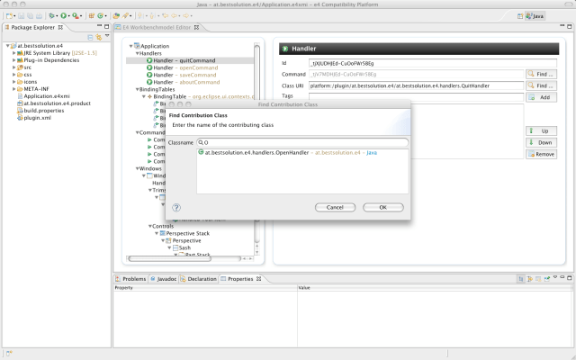 The decision I had to draw is how to split things up so that they can get part of a “native” e4 application (=application not running the compat layer) and plug into the e4-SDK. So I created 3 bundles:
