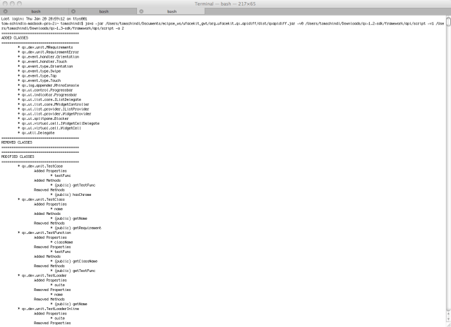 This was until Andreas Ecker from the qooxdoo team pointed me to an interesting Meta-Data information the generator spits out for the API-Viewer. It took me about an hour to write a small Java-Programm which created a diff of those .json-Files.