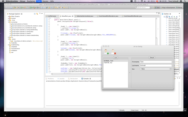 Tom, can you update the list of projects needed as I downloaded the referenced git repo but the projects in there don’t all match up with the projects displayed in the screenshots. We have a large swing app and the thought of moving to e4 and rewriting the UI in SWT is considered a non-starter by the powers that be. However, if I can see your demo and learn how it works then we may still be able to adopt the platform underneath.