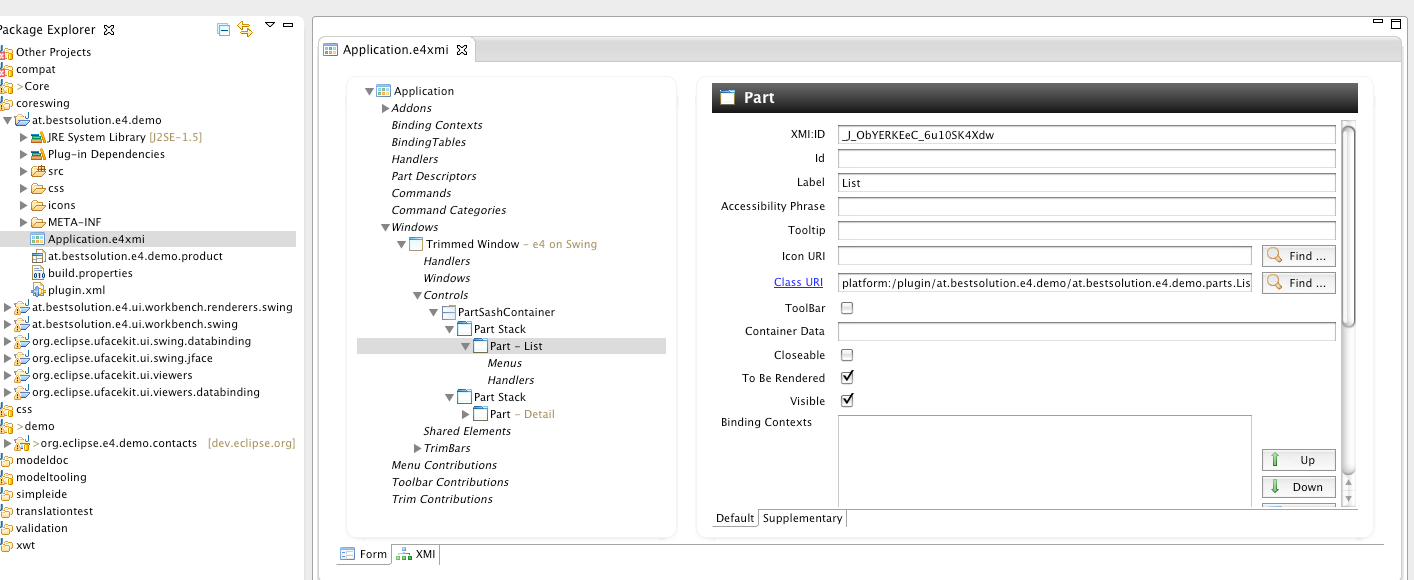 To make it possible to write e.g. Swing-Applications using the Eclipse 4 Application the only requirement is that someone wrote a replacement for the default rendering engine provided by default by the e4-Team. To find out how much effort it would be to write such a thing I’ve experimented a bit yesterday and have to admit it’s doable using the SWT-Implementation and translating into Swing calls. Hacking for about 5 hours I had a minimal Swing-Application running on.