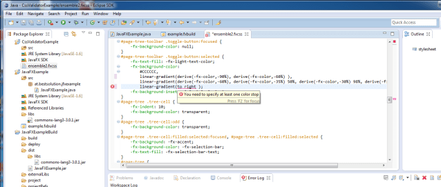 Once more I improved the CSS compability. The feature that took most of my time was support for the new CSS-compatible gradient syntax (the new syntax will get part of one of the next JavaFX-Builds). Currently validation of linear-gradients is supported, radial support will follow in the next release.