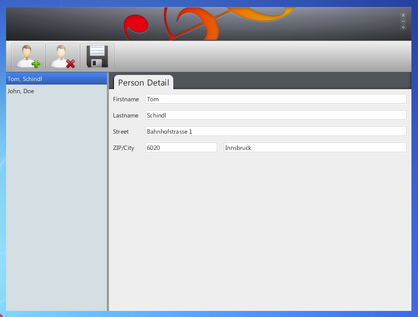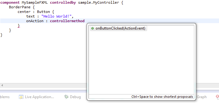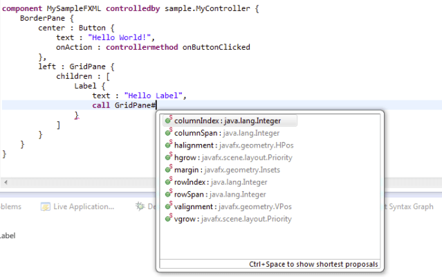 What I think is very nice is how the EAP, FXGraph (FXML), Eclipse Databinding and DI can work together to create an UI. Take a look at the following code:
