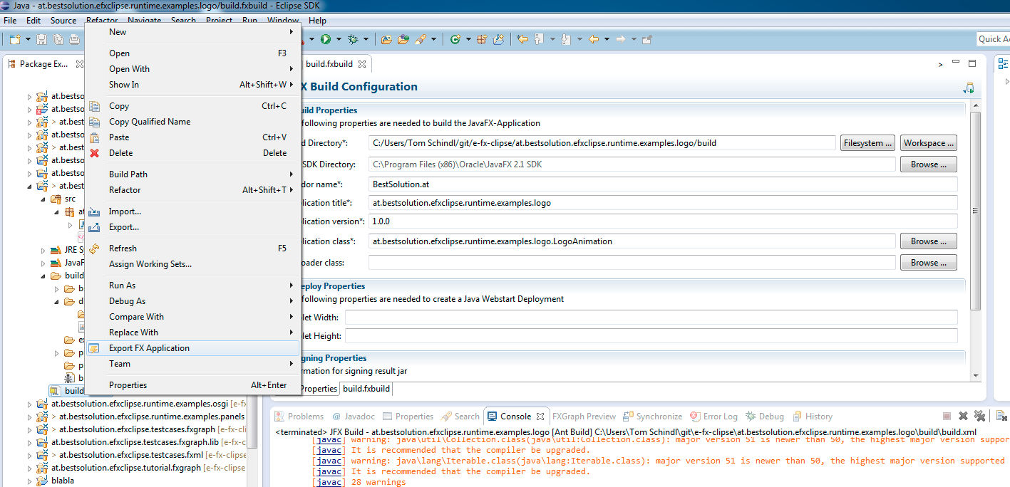 Last step is to use the built-in application export of e(fx)clipse which uses JavaFX’s ant-task to export an application