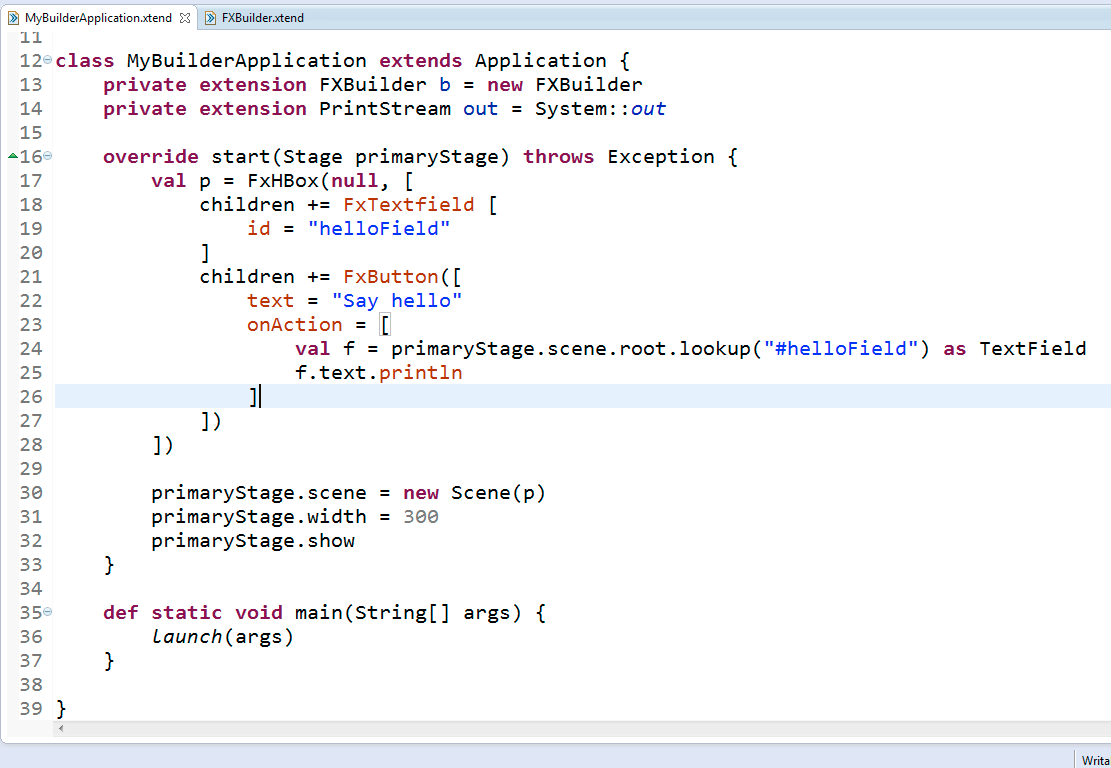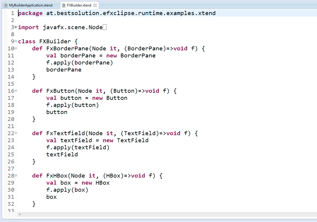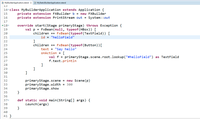 So I couldn’t resist – and just for Chris Aniszczyk 😉 – another blog post on this topic. So I wrapped my head around this builder stuff of xtend and with the sources provided by Sven at github I managed to write a small builder for JavaFX.