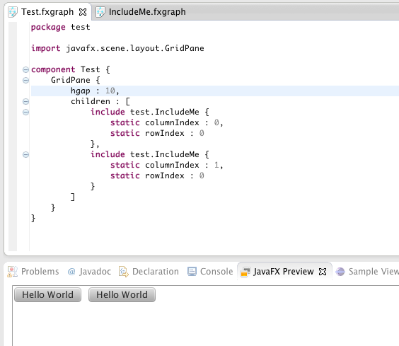 I’ve introduced a new syntax to define static properties. In FXML static calls used for layouting look like this: