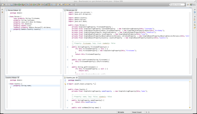 Inspired by a forum thread I spend a few hours prototyping a JavaFX-Bean definition language to remove the boilerplate code.