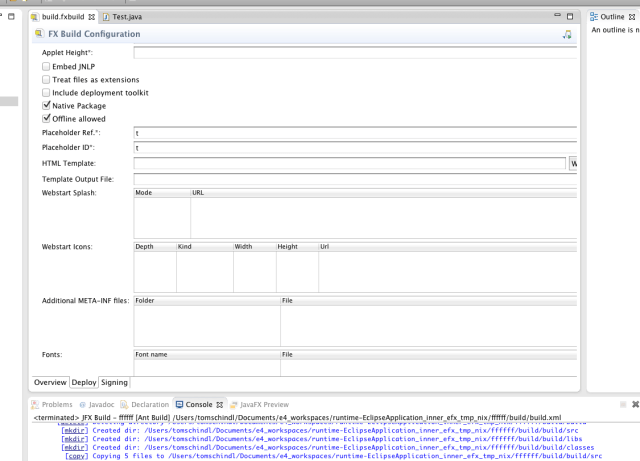 We now have a new fxbuild-File editor which provides support for all features of javafx ant tasks. We have switched the storage from a plain properties file to an XML one which is backed by an EMF-Ecore model.