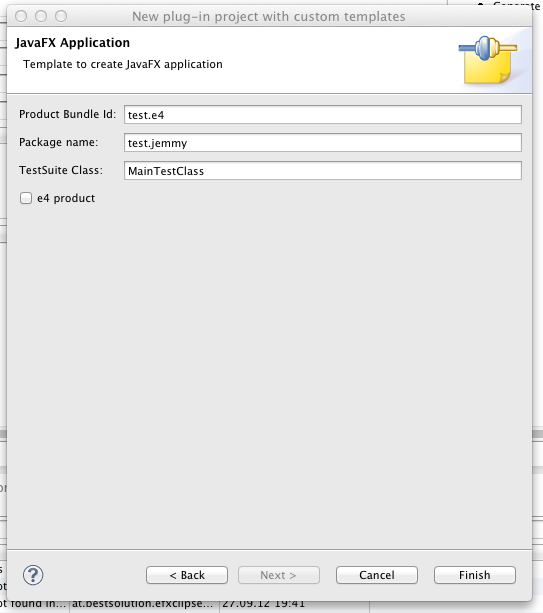 To make bootstraping a Jemmy JUnit-Test infrastructure for your OSGi and e4 JavaFX project as simple as possible there’s a new wizard provide to you.