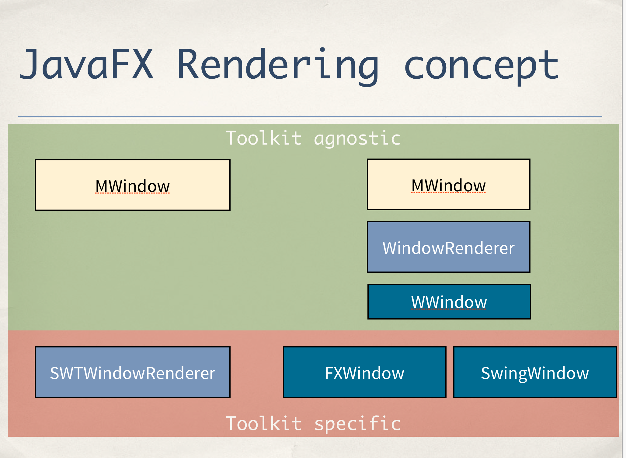 On the left you see how the SWT one works and on the right handside how the JavaFX one is structured. The cool thing is that all the complex logic with lazy activation, … is implemented in an toolkit agonostic way and abstracted throught W*-Interfaces (git-repo).