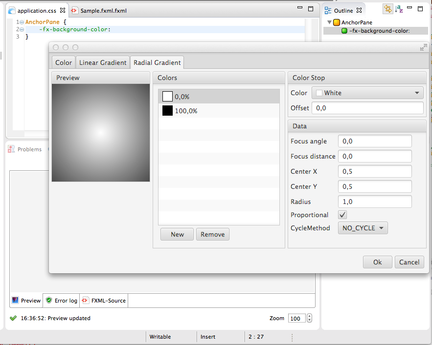 - Once you are happy with your gradient. Hit ok and the gradient is inserted into your CSS-Stylesheet and in case your FXML-File is connected to the currently edited stylesheet the preview will update itself