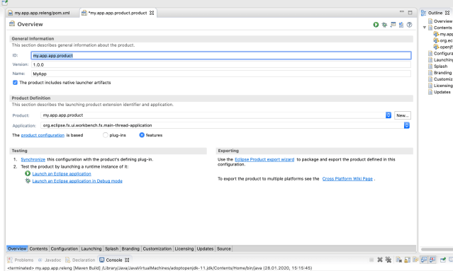 As we anyway have to produce a platform-dependent we can also add the creation of a native launcher. For that open your .product-File: