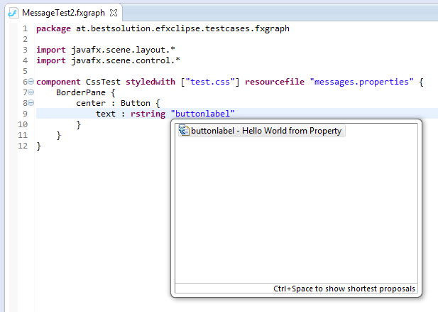 FXML currently does not support to encode custom informations into it because it does not allow one to use itsown XML-Namespace. To make the live preview load the CSS-Files and message.properties one has to add a mapping file in the root directory of the project. The FXML-Wizard will create one for you, if you already have fxml-Files and want to add the configuration-file your own simply create a file named “fxml-preview.properties” in your project (at the toplevel, not inside the src-Folder) and add the following content: